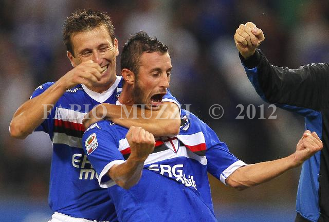 | ITALY, Genova : Sampdoria's Stefano Guberti (R) is celebrated by teammate Daniele Gastaldello after scoring against Lazio during their serie A football match at Luigi Ferraris stadium in Genova on August 29, 2010. AFP PHOTO / FABIO MUZZI | IMAGE_4061.JPG | 29/08/10 21.13 | |