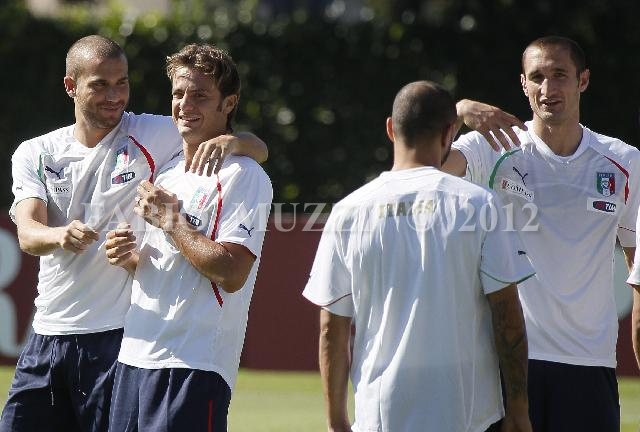 | ITALY, COVERCIANO : from left, Lorenzo De Silvestri jokes with Alberto Gilardino past Giorgio Chiellini (R) prior the trainning session at the Italian Football Federation technical center of Coverciano in Florence on August 31, 2010. (AFP PHOTO / FABIO MUZZI) | IMAGE_4064.JPG | 31/08/10 9.34 | |