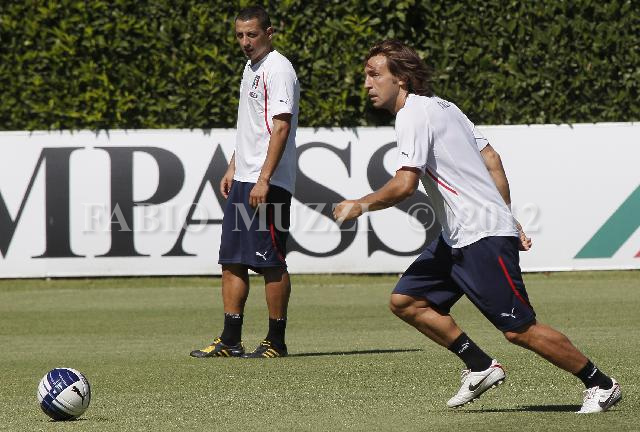 | ITALY, COVERCIANO : Italy's national football player Andrea Pirlo (R) in action during a trainning session at the Italian Football Federation technical center of Coverciano in Florence on August 31, 2010. (AFP PHOTO / FABIO MUZZI) | IMAGE_4074.JPG | 31/08/10 10.36 | |