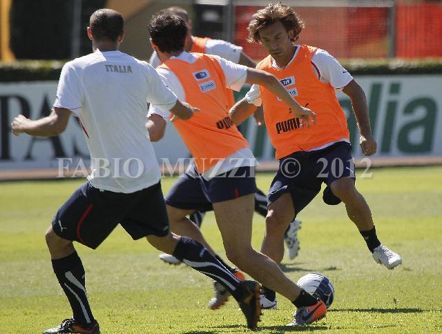 | ITALY, COVERCIANO : Italy's national football player Andrea Pirlo (R) in action during a trainning session at the Italian Football Federation technical center of Coverciano in Florence on August 31, 2010. (AFP PHOTO / FABIO MUZZI) | IMAGE_4076.JPG | 31/08/10 10.42 | |