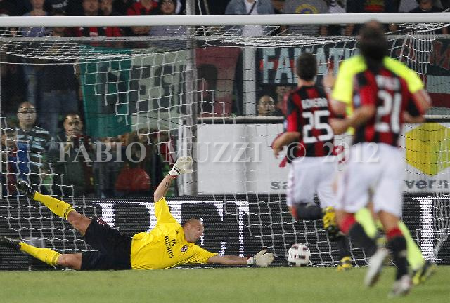 | ITALY, Cesena : Cesena's Emanuele Giaccherini (not seen) scored against AC Milan's goalkeeper Christian Abbiati during their serie A football match at Dino Manuzzi stadium in Cesena on September 11, 2010. AFP PHOTO / FABIO MUZZI | IMAGE_4092.JPG | 11/09/10 20.32 | |