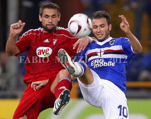 | ITALY, Genova : Sampdoria's Giampaolo Pazzini (R) fight for the ball with Debrecen's Dajan Simacduring their Uefa Champions League, Round 32, Group C1 football match Sampdoria vs Debrecen at Luigi Ferraris stadium in Genoa on September 30, 2010. AFP PHOTO / FABIO MUZZI | IMAGE_4115.JPG | 30/09/10 18.34 | |
