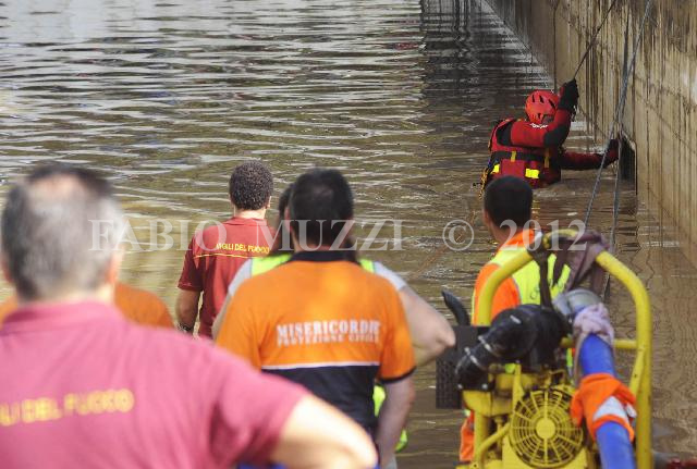 | ITALY, Prato : italian fireman rescue works on a car buried in a subway of the main street of Prato town, fully flooded after that a thunderstorm of this nigh-morning has interested the tuscany and liguria region causing deads in Prato, on October 05, 2010 (AFP PHOTO / FABIO MUZZI) | IMAGE_4121.JPG | 05/10/10 10.58 | |