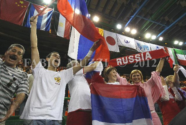 | ITALY, Florence : Russia'a supporters incite his players before thematch against Serbia in their Volleyball World Championships third round match at Nelson Mandela Forum in Florence on October 05, 2010. AFP PHOTO / FABIO MUZZI | IMAGE_4124.JPG | 05/10/10 16.02 | |
