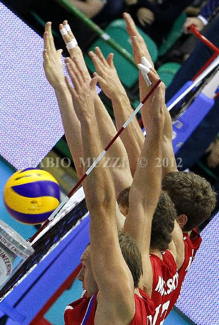 | ITALY, Florence : Russia's players take a barrier against a Serbia'smash during their Volleyball World Championships third round match at Nelson Mandela Forum in Florence on October 05, 2010. AFP PHOTO / FABIO MUZZI | IMAGE_4129.JPG | 05/10/10 16.19 | |