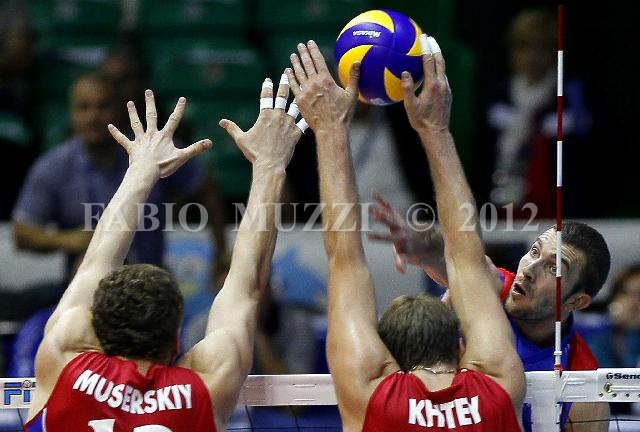 | ITALY, Florence : Serbia's Nikola Kovacevic (R) smash against Russia's Dmitriy Musersky (L) and Taras Khtey during their Volleyball World Championships third round match at Nelson Mandela Forum in Florence on October 05, 2010. AFP PHOTO / FABIO MUZZI | IMAGE_4132.JPG | 05/10/10 16.35 | |