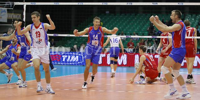| ITALY, Florence : Serbia's players celebrates the victory against Russia for 3-1 in their Volleyball World Championships third round match at Nelson Mandela Forum in Florence on October 05, 2010. AFP PHOTO / FABIO MUZZI | IMAGE_4137.JPG | 05/10/10 17.58 | |
