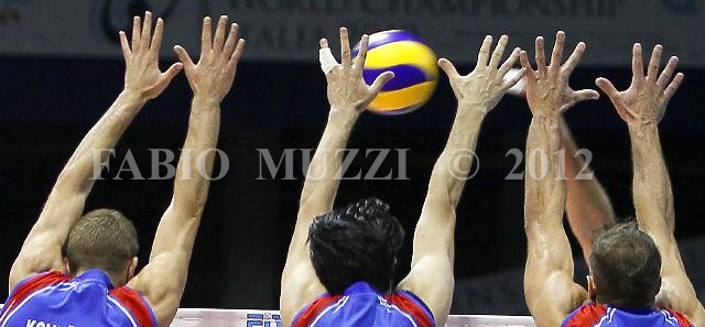| ITALY, Florence : Serbia's players in action during their Volleyball World Championships third round match at Nelson Mandela Forum in Florence on October 05, 2010. AFP PHOTO / FABIO MUZZI | IMAGE_4138.JPG | 05/10/10 17.58 | |