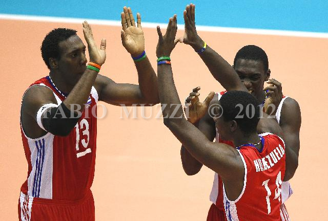 | ITALY, Florence : from left, Cuba's Simon Aties Robertland together teammates Aguirre Hierrezuelo and Robert Camejo cheers after gaining a point against Spain during their Volleyball World Championships third round match at Nelson Mandela Forum in Florence on October 05, 2010. AFP PHOTO / FABIO MUZZI | IMAGE_4141.JPG | 05/10/10 20.05 | |