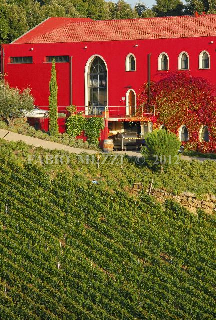 | ITALY, Riparbella : a view of Caiarossa vinery in Riparbella on October 4, 2010. Caiarossa is a vinery placed in Cecina Valley, on Tyrrhenian coast east of tuscany, surrounded by its fourteen hectares of vineyards, at an altitude of 150 to 250 meters above sea level, producing eleven different grape varieties as Sangiovese, Merlot, Cabernet Franc, Cabernet Sauvignon, Petit Verdot, Syrah, Grenache, Mourvèdre, Chardonnay, Viognier, Petit Mansengand furnishing four types of wine. The vinery has embraced the principles of biodynamic farming, geo-biological architecture and oriental chinese Feng Shui discipline, where the colours of the winery, red outside and intense yellow inside, represent wine, soil, and sun. The agricultural activities are regulated following the lunar and planety calendar and irroring vineyards with infusions of with infusions of nettle, willow, chamomile and horsetail. AFP PHOTO / FABIO MUZZI | IMAGE_4154.JPG | | |