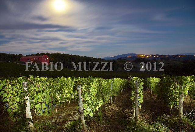 | ITALY, Riparbella : a moon night view of Caiarossa's vineyards in Riparbella on October 4, 2010. Caiarossa is a vinery placed in Cecina Valley, on Tyrrhenian coast east of tuscany, surrounded by its fourteen hectares of vineyards, at an altitude of 150 to 250 meters above sea level, producing eleven different grape varieties as Sangiovese, Merlot, Cabernet Franc, Cabernet Sauvignon, Petit Verdot, Syrah, Grenache, Mourvèdre, Chardonnay, Viognier, Petit Mansengand furnishing four types of wine. The vinery has embraced the principles of biodynamic farming, geo-biological architecture and oriental chinese Feng Shui discipline, where the colours of the winery, red outside and intense yellow inside, represent wine, soil, and sun. The agricultural activities are regulated following the lunar and planety calendar and irroring vineyards with infusions of with infusions of nettle, willow, chamomile and horsetail. AFP PHOTO / FABIO MUZZI | IMAGE_4156.JPG | | |