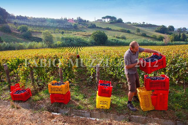 | ITALY, Riparbella : manager winemaker Dominique Genot of France works into the vineyards of Caiarossa vinery during the grape harvest in Riparbella on October 4, 2010. Caiarossa is a vinery placed in Cecina Valley, on Tyrrhenian coast east of tuscany, surrounded by its fourteen hectares of vineyards, at an altitude of 150 to 250 meters above sea level, producing eleven different grape varieties as Sangiovese, Merlot, Cabernet Franc, Cabernet Sauvignon, Petit Verdot, Syrah, Grenache, Mourvèdre, Chardonnay, Viognier, Petit Mansengand furnishing four types of wine. The vinery has embraced the principles of biodynamic farming, geo-biological architecture and oriental chinese Feng Shui discipline, where the colours of the winery, red outside and intense yellow inside, represent wine, soil, and sun. The agricultural activities are regulated following the lunar and planety calendar and irroring vineyards with infusions of with infusions of nettle, willow, chamomile and horsetail. AFP PHOTO / FABIO MUZZI | IMAGE_4157.JPG | | |