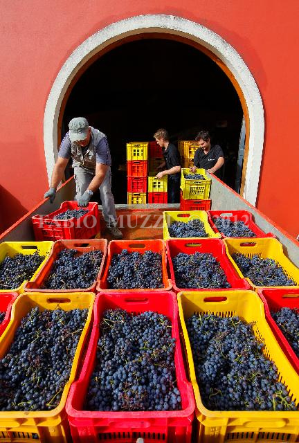 | ITALY, Riparbella : Employees work in Caiarossa vinery collecting basket of red grapes during the grape harvest in Riparbella on October 4, 2010. Caiarossa is a vinery placed in Cecina Valley, on Tyrrhenian coast east of tuscany, surrounded by its fourteen hectares of vineyards, at an altitude of 150 to 250 meters above sea level, producing eleven different grape varieties as Sangiovese, Merlot, Cabernet Franc, Cabernet Sauvignon, Petit Verdot, Syrah, Grenache, Mourvèdre, Chardonnay, Viognier, Petit Mansengand furnishing four types of wine. The vinery has embraced the principles of biodynamic farming, geo-biological architecture and oriental chinese Feng Shui discipline, where the colours of the winery, red outside and intense yellow inside, represent wine, soil, and sun. The agricultural activities are regulated following the lunar and planety calendar and irroring vineyards with infusions of with infusions of nettle, willow, chamomile and horsetail. AFP PHOTO / FABIO MUZZI | IMAGE_4162.JPG | | |