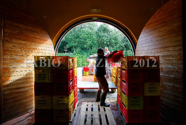 | ITALY, Riparbella : Employees work in Caiarossa vinery collecting basket of red grapes during the grape harvest in Riparbella on October 4, 2010. Caiarossa is a vinery placed in Cecina Valley, on Tyrrhenian coast east of tuscany, surrounded by its fourteen hectares of vineyards, at an altitude of 150 to 250 meters above sea level, producing eleven different grape varieties as Sangiovese, Merlot, Cabernet Franc, Cabernet Sauvignon, Petit Verdot, Syrah, Grenache, Mourvèdre, Chardonnay, Viognier, Petit Mansengand furnishing four types of wine. The vinery has embraced the principles of biodynamic farming, geo-biological architecture and oriental chinese Feng Shui discipline, where the colours of the winery, red outside and intense yellow inside, represent wine, soil, and sun. The agricultural activities are regulated following the lunar and planety calendar and irroring vineyards with infusions of with infusions of nettle, willow, chamomile and horsetail. AFP PHOTO / FABIO MUZZI | IMAGE_4163.JPG | | |