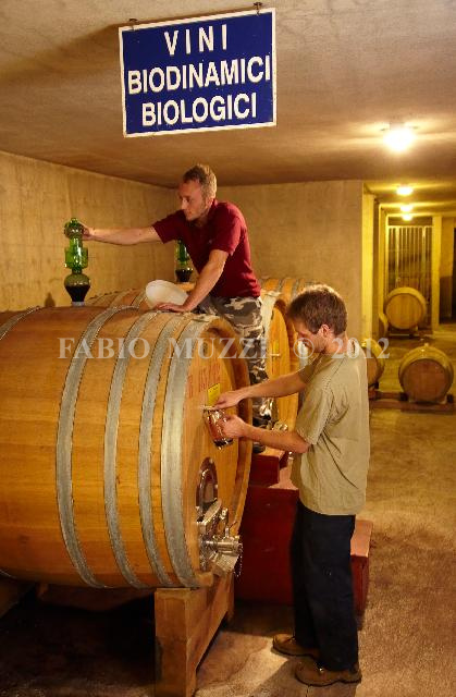 | ITALY, Riparbella : Employees control a wine cask contains red wine produced through byodinamic and biological process inside the cellar of Caiarossa vinery during the grape harvest in Riparbella on October 4, 2010. Caiarossa is a vinery placed in Cecina Valley, on Tyrrhenian coast east of tuscany, surrounded by its fourteen hectares of vineyards, at an altitude of 150 to 250 meters above sea level, producing eleven different grape varieties as Sangiovese, Merlot, Cabernet Franc, Cabernet Sauvignon, Petit Verdot, Syrah, Grenache, Mourvèdre, Chardonnay, Viognier, Petit Mansengand furnishing four types of wine. The vinery has embraced the principles of biodynamic farming, geo-biological architecture and oriental chinese Feng Shui discipline, where the colours of the winery, red outside and intense yellow inside, represent wine, soil, and sun. The agricultural activities are regulated following the lunar and planety calendar and irroring vineyards with infusions of with infusions of nettle, willow, chamomile and horsetail. AFP PHOTO / FABIO MUZZI | IMAGE_4167.JPG | | |