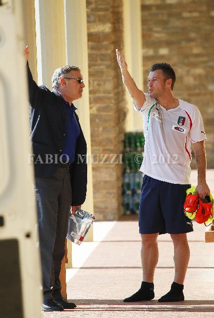 | ITALY, Florence : Italy's national player Antonio Cassano (R) speaks to Gigi Riva at the end of the training session at the Italian Football Federation technical center of Coverciano in Florence, on October 07 2010. Italy will face Ireland in Belfast next October 08 for their Euro 2012 European Championship Qualifying group stage match. (AFP PHOTO/ FABIO MUZZI) | IMAGE_4181.JPG | 07/10/10 10.29 | |