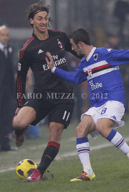 | ITALY, Genova : AC Milan's Zlatan Ibrahimovic of Sweden (L) in acion afainst Sampdoria's Stefano Guberti during their serie A football match at Luigi Ferraris stadium in Genova on November 27, 2010. AFP PHOTO / FABIO MUZZI | IMAGE_4253.JPG | 27/11/10 18.07 | |