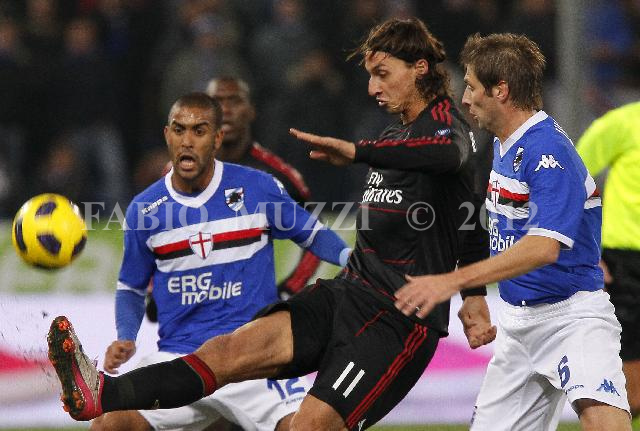 | ITALY, Genova : AC Milan's Zlatan Ibrahimovic (C) in action against Sampdoria's Fernando Tissone (L) of Argentina and his teammate Stefano Lucchi during their serie A football match at Luigi Ferraris stadium in Genova on November 27, 2010. AFP PHOTO / FABIO MUZZI | IMAGE_4258.JPG | 27/11/10 18.22 | |
