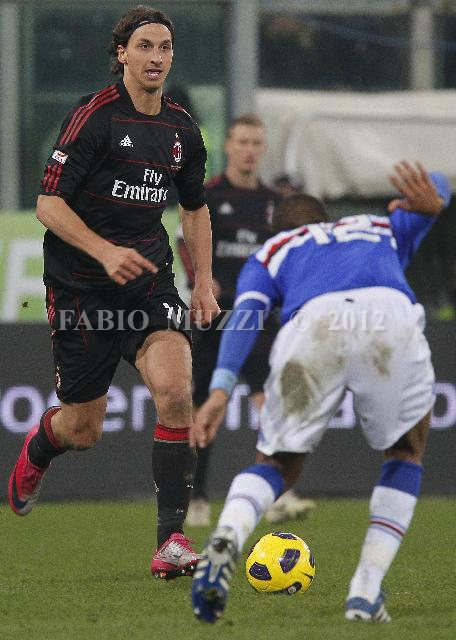 | ITALY, Genova : AC Milan's Zlatan Ibrahimovic of Sweden (L) in action against Sampdoria's Fernando Tissone of Argentina during their serie A football match at Luigi Ferraris stadium in Genova on November 27, 2010. AFP PHOTO / FABIO MUZZI | IMAGE_4265.JPG | 27/11/10 19.14 | |