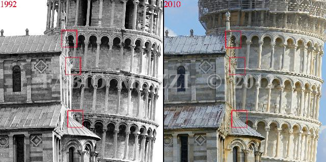 | ITALY, Pisa : this alternative combo crop of the image show the leaning tower before the stabilization works (1992-L) and after (2010-R) Into the rings in red is possible see the differencies of the level of inclination that the tower has recoverd after this intervation works, on December 02, 2010 (AFP PHOTO / FABIO MUZZI) | IMAGE_4293.JPG | 02/12/10 12.21 | |