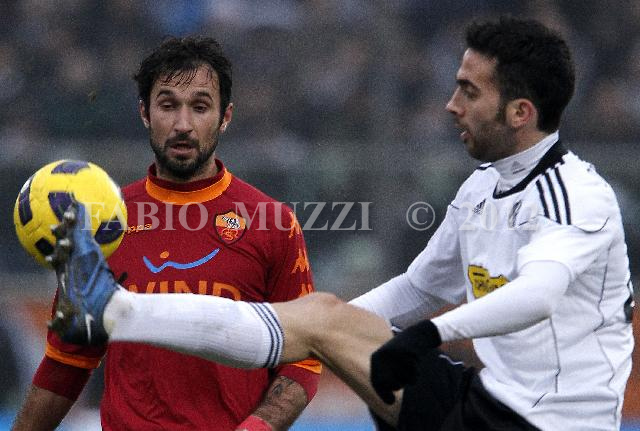 | ITALY, Cesena : Cesena'sPaolo Hernan Dellafiore (L) kicks the ball against AS Roma's Mirko Vulcinic of Montenegro during their serie A football match at Dino Manuzzi stadium in Cesena on January, 2011. AFP PHOTO / FABIO MUZZI | IMAGE_4317.JPG | 16/01/11 16.22 | |