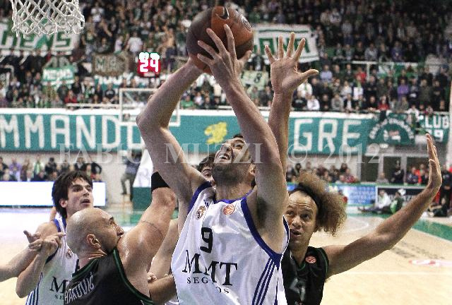 | ITALY, Siena : Real Madrid's Felipe Meyes (C) in action against Montepaschi's Siena Milovan Rankovic (L) and Shaun Stonerook (R)during their EuroLeague basketball top 16 match, Groupe G, in Siena on January 26, 2011. (AFP PHOTO / FABIO MUZZI) | IMAGE_4337.JPG | 26/01/11 20.52 | |
