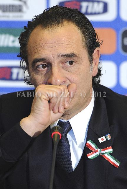 | ITALY, Florence : Italian's national football team coach Cesare Prandelli, with little emblemas of Italy and Japan on the jacket, during the press conference prior the training session at the Italian Football Federation technical center of Coverciano in Florence, on March 21 2011. Italy will face Slovenia in Ljubliana, next Friday 25, for the European' qualification match. (AFP PHOTO/ FABIO MUZZI) | IMAGE_4380.JPG | 21/03/11 13.57 | |