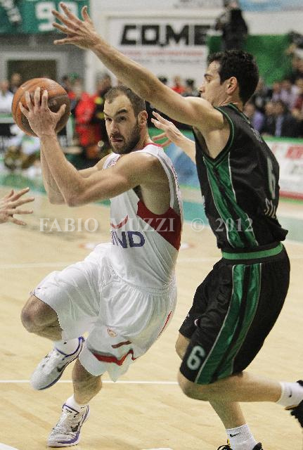| ITALY, Siena : Olympiacos' Piraeus Vassilis Spanoulis (L) in action against Montepaschi's Siena Nikolaus Zisis during their Euroleague basketball Playoff, Game 4, on March 31, 2011 in Siena. (AFP PHOTO/ FABIO MUZZI) | IMAGE_4385.JPG | 31/03/11 20.11 | |