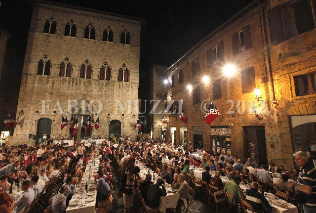 | ITALY, Siena : Traditional dinner the night in the street of the Contrada of Owl prior the race of the Palio of 02, in Siena 01 July 2011.The Palio is a medieval horse race and pageant, which pits the ancient districts of Siena against each other in competition for the victory banner and in honor of the Virgin Mary. AFP PHOTO/ FABIO MUZZI | IMAGE_4420.JPG | 01/07/11 21.56 | |