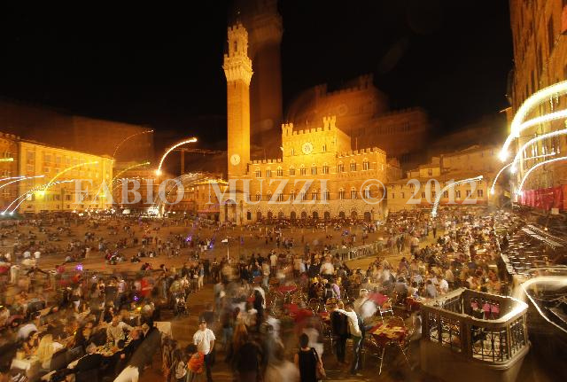 | ITALY, Siena : A night view of the square "Il Campo of Siena the day before the race of the Palio of 02, in Siena 01 July 2011.The Palio is a medieval horse race and pageant, which pits the ancient districts of Siena against each other in competition for the victory banner and in honor of the Virgin Mary. AFP PHOTO/ FABIO MUZZI | IMAGE_4422.JPG | 01/07/11 22.20 | |