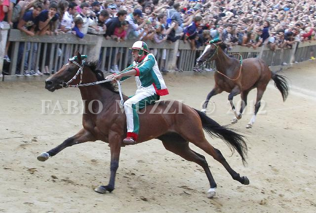 | ITALY, Siena : The jocker and the horse of the Contrada og Goose win the race of the Palio.The Palio is a medieval horse race and pageant, which pits the ancient districts of Siena against each other in competition for the victory banner and in honor of the Virgin Mary. AFP PHOTO/ FABIO MUZZI | IMAGE_4430.JPG | 02/07/11 18.50 | |