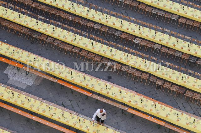 | ITALY, Siena : waiter prepares the tables on the street of the town of Siena for the incoming traditional dinner of Contrade, in Siena on August 15, 2011. The Palio of Siena race (known locally simply as Il Palio) is held twice a year in the Tuscan city of Siena, in which jockeys ride bareback around a makeshift race course set up in the city's central square. AFP PHOTO / FABIO MUZZI | IMAGE_4447.JPG | 15/08/11 18.09 | |