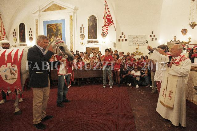 | ITALY, Siena : horse of the Contrada of Giraffe is blessed by priest into the church to receive the benediction prior the race of the Palio, in Siena, on August 16, 2011. The Palio of Siena race (known locally simply as Il Palio) is held twice a year in the Tuscan city of Siena, in which jockeys ride bareback around a makeshift race course set up in the city's central square. AFP PHOTO / FABIO MUZZI | IMAGE_4450.JPG | 16/08/11 13.52 | |