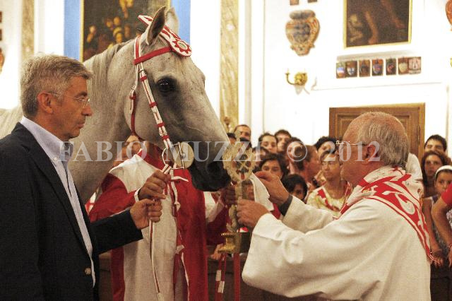 | ITALY, Siena : horse of the Contrada of Giraffe is blessed by priest into the church to receive the benediction prior the race of the Palio, in Siena, on August 16, 2011. The Palio of Siena race (known locally simply as Il Palio) is held twice a year in the Tuscan city of Siena, in which jockeys ride bareback around a makeshift race course set up in the city's central square. AFP PHOTO / FABIO MUZZI | IMAGE_4451.JPG | 16/08/11 13.52 | |
