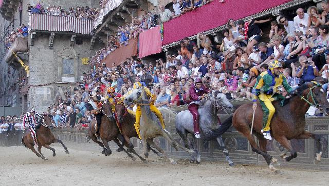| ITALY, Siena : a passage of the horses at Casato curve during the race of the Palio, in Siena, on August 16, 2011. The Palio of Siena race (known locally simply as Il Palio) is held twice a year in the Tuscan city of Siena, in which jockeys ride bareback around a makeshift race course set up in the city's central square. AFP PHOTO / FABIO MUZZI | IMAGE_4453.JPG | 16/08/11 18.30 | |