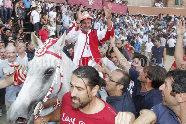 | ITALY, Siena : jockey of Contrada of Giraffe Andrea Mari win the race of the Palio, in Siena, on August 16, 2011. The Palio of Siena race (known locally simply as Il Palio) is held twice a year in the Tuscan city of Siena, in which jockeys ride bareback around a makeshift race course set up in the city's central square. AFP PHOTO / FABIO MUZZI | IMAGE_4456.JPG | 16/08/11 18.33 | |
