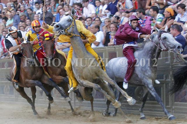 | ITALY, Siena : a passage of the horses at Casato curve during the race of the Palio, in Siena on August 16, 2011. The Palio of Siena race (known locally simply as Il Palio) is held twice a year in the Tuscan city of Siena, in which jockeys ride bareback around a makeshift race course set up in the city's central square. AFP PHOTO / FABIO MUZZI | IMAGE_4463.JPG | 16/08/11 18.30 | |