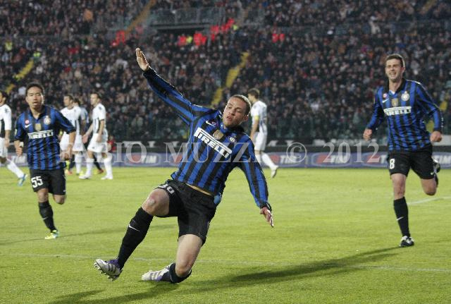 | ITALY, Siena : Inter's Luc Castaignos (C) celebrates after scored against Siena during their serie A football match at Artemio Franchi stadium in Siena on November 27, 2011. AFP PHOTO / FABIO MUZZI | IMAGE_4538.JPG | 27/11/11 17.48 | |