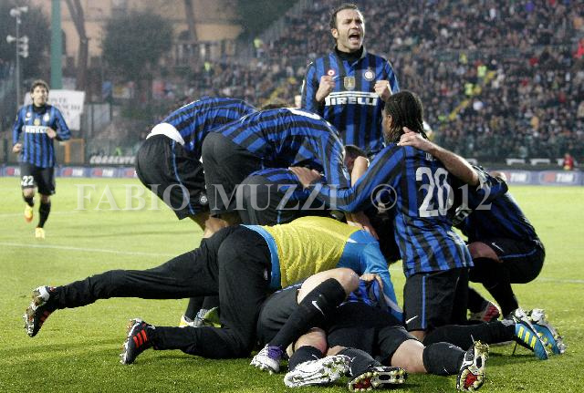 | ITALY, Siena : Inter's Luc Castaignos , on the pitch not seen, is celebrated by teammate after scored against Siena during their serie A football match at Artemio Franchi stadium in Siena on November 27, 2011. AFP PHOTO / FABIO MUZZI | IMAGE_4539.JPG | 27/11/11 17.48 | |