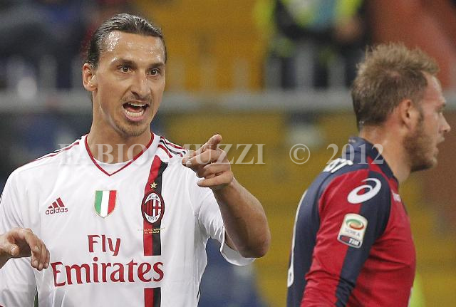| ITALY, Genova : Mian's Zlatan Ibrahimovic of Sweden (L) reacts during their serie A football match at Luigi Ferraris stadium in Genova on December 02, 2011. AFP PHOTO / FABIO MUZZI | IMAGE_4541.JPG | 02/12/11 21.28 | |