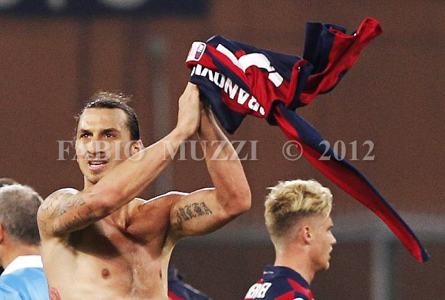 | ITALY, Genova : Milan's Zlatan Ibrahimovic of Sweden cheers with his supporters at the end of the match won 2-0 against Genoa in their serie A football match at Luigi Ferraris stadium in Genova on December 02, 2011. AFP PHOTO / FABIO MUZZI | IMAGE_4545.JPG | 02/12/11 22.49 | |