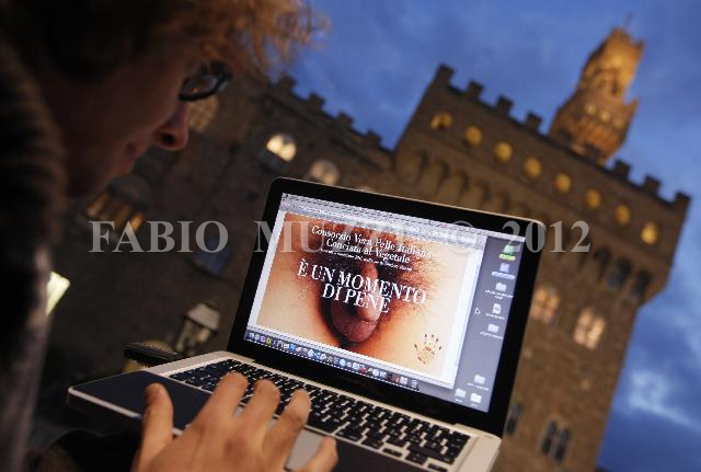 | ITALY, Florence : an image of the new 2012 calendar made by Oliviero Toscani is showed into a computer in Piazza della Signoria of Florence. The new 2012 calendar is presented today in Florence and realized for the Consortium Vera Pelle Italiana company in Florence on January 12, 2012. AFP PHOTO / FABIO MUZZI | IMAGE_4566.JPG | 12/01/12 18.20 | |