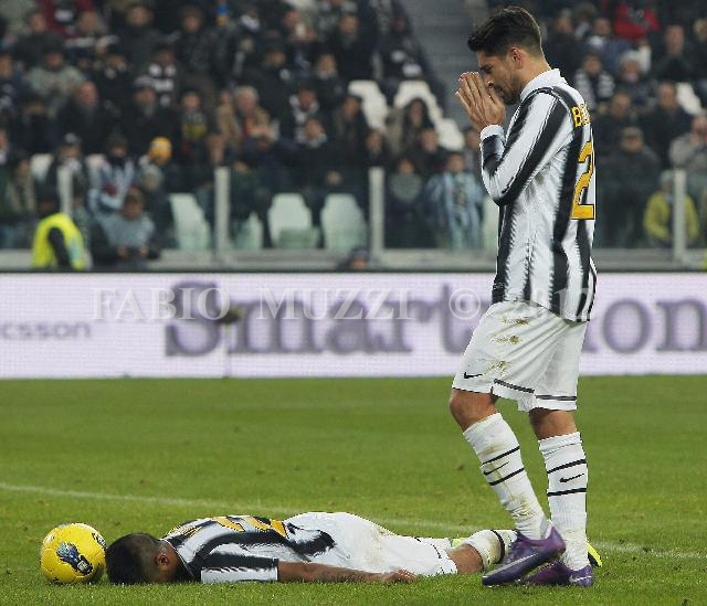 | ITALY, Turin : Juventus' Arturo Vidal of Chili (on the pitch) and Marco Borriello reacts at the end of the match in their serie A football match at the "Juventus Stadium" in Turin on January 15, 2012. AFP PHOTO / FABIO MUZZI | IMAGE_4576.JPG | 15/01/12 17.51 | |