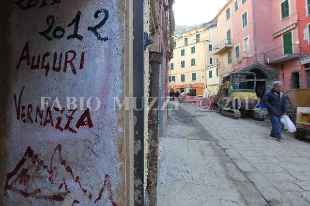 | ITALY, Vernazza : sign of happy new year 2012 wrote inside a door in the main street of Vernazza after the flooding occurred on October 25 2011, in Vernazza on January 18, 2012. AFP PHOTO / FABIO MUZZI | IMAGE_4585.JPG | 18/01/12 13.14 | |