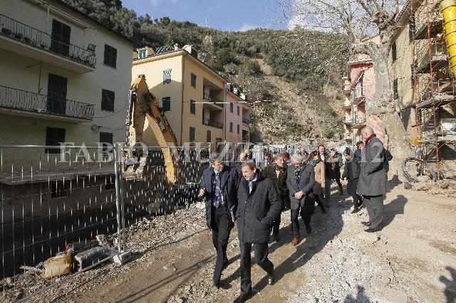| ITALY, Vernazza : UE Commissioner for Regional Policy Johannes Hahn (C) with president of Liguria Region Claudio Burlando (L) and Mayor of Vernazza Vincenzo Resasco to visit Vernazza after the flooding occurred on October 25 2011, in Vernazza on January 18, 2012. AFP PHOTO / FABIO MUZZI | IMAGE_4586.JPG | 18/01/12 14.57 | |