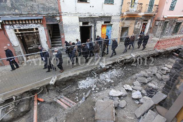 | ITALY, Vernazza : UE Commissioner for Regional Policy Johannes Hahn (L) together the President of Liguria Region Claudio Burlando walk and visit Vernazza after the flooding occurred on October 25 2011, in Vernazza on January 18, 2012. AFP PHOTO / FABIO MUZZI | IMAGE_4587.JPG | 18/01/12 15.04 | |