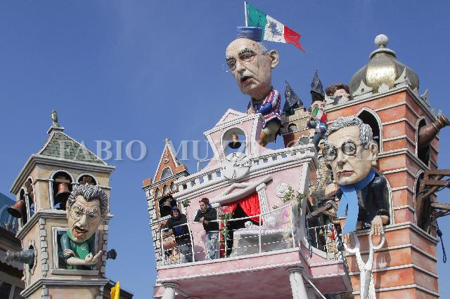 | ITALY, Viareggio : a carnival float called "Garibaldi fu ferito" showing Montecitorio and Italian president of Republic Giorgio Napolitano (C) together other politcians as Umberto Bossi (L) parades during traditional carnival in Viareggio on February 05, 2012 (AFP PHOTO / FABIO MUZZI) | IMAGE_4600.JPG | 05/02/12 12.21 | |