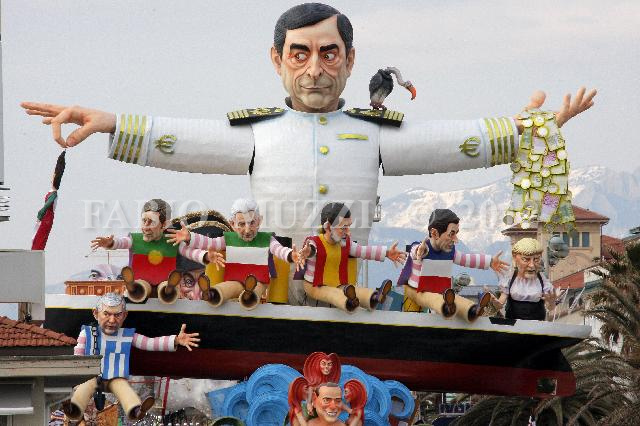 | ITALY, Viareggio : giant carnival float called "Ma dov'è questa crisi" with the mask of BCE president Mario Draghi on the top together the other european leaders parades during the traditional carnival in Viareggio on February 05, 2012 (AFP PHOTO / FABIO MUZZI) | IMAGE_4606.JPG | 05/02/12 16.08 | |