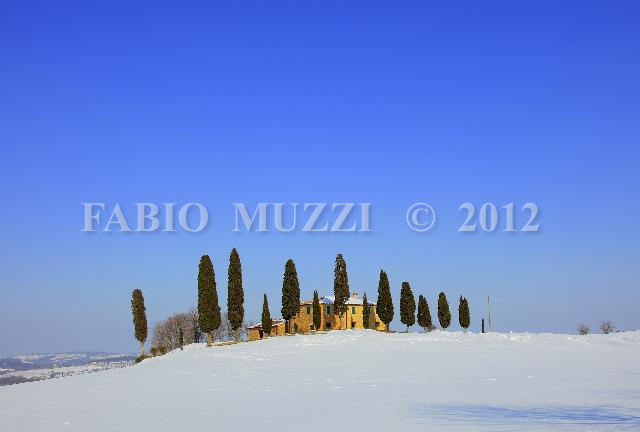 | ITALY, San Quirico : an image of traditional tuscan landscapes with farm full covered by snow in Pienza, Orcia valley, central Italy, on February 13, 2012. AFP PHOTO / FABIO MUZZI | IMAGE_4613.JPG | 13/02/12 16.17 | |