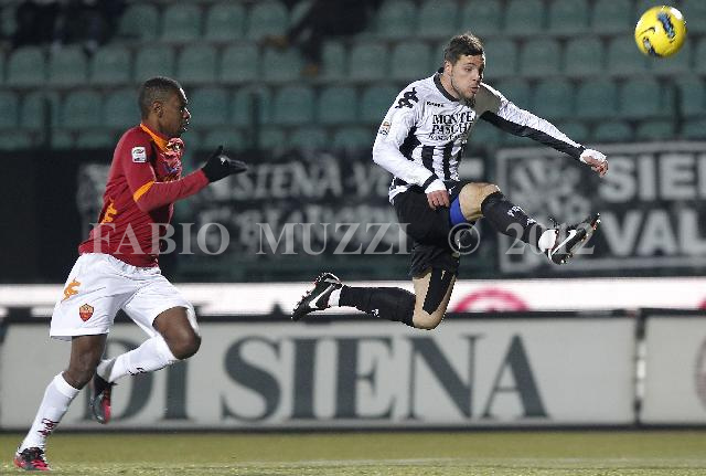 | ITALY, Siena : Siena's Mattia Destro (R) tries to scores past AS Roma's Silveira Do Santos of Brazil during their serie A football match at Artemio Franchi stadium in Siena on February 13, 2012. AFP PHOTO / FABIO MUZZI | IMAGE_4615.JPG | 13/02/12 20.58 | |